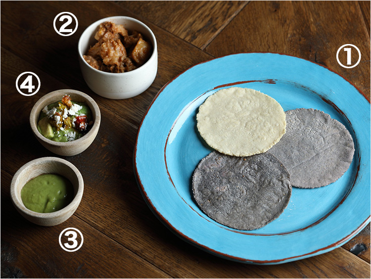 今回は、タコスの生地「①コーントルティーヤ」、豚肉を使った具材「②カルニタス」、具にかけるサルサ「③サルサ・クルーダ」、付け合わせとしてアボカドを使った人気のディップ「④ワカモレ」をご紹介します。すべて久松シェフのオリジナルレシピです!